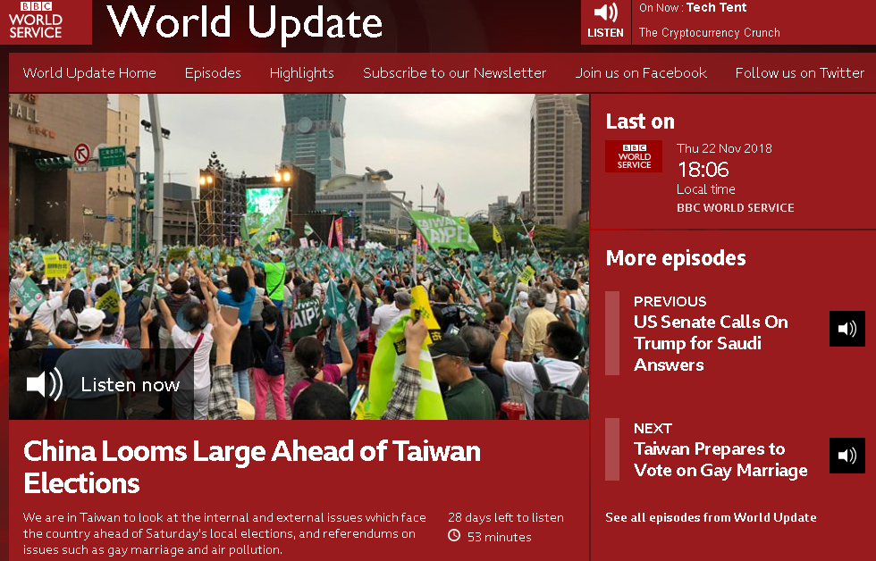 BBC節目World Update主持人戴蒙(Dan Damon)在台北與倫敦連線,22日以「台灣選舉前中國陰影籠罩」(China Looms Large Ahead of Taiwan Elections)為題,探討即將登場的九合一大選。
