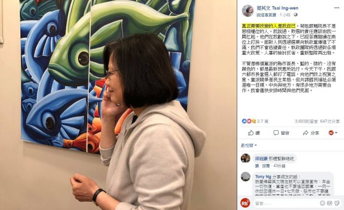 蔡總統今天透過臉書貼文指出,「真正需要改變的人是我自己」。陳菊跟賴清德不是戀棧權位的人。「我說過,敗選的責任應該由我一肩扛起,他們在我勸說之下,已經答應繼續在崗位上打拚」。