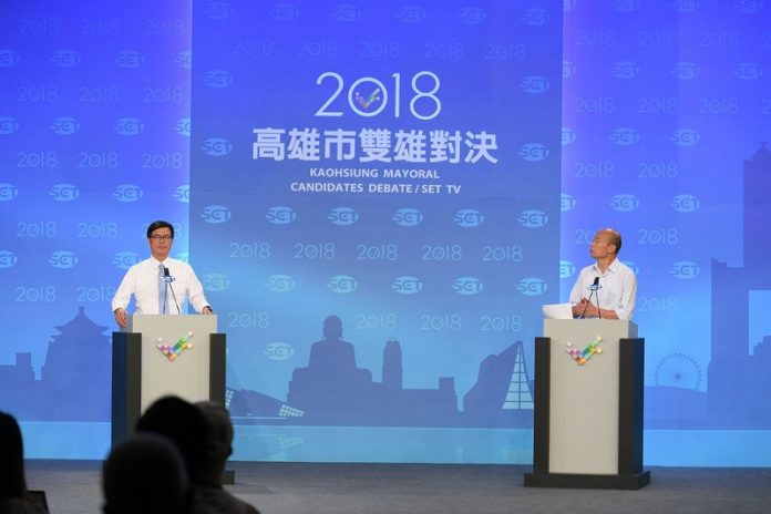 選戰倒數5天,三立電視台19日晚間8時舉辦高雄市長選舉電視辯論會,民進黨候選人陳其邁與國民黨候選人韓國瑜正面交鋒、砲火四射。陳其邁在一開始申論發言時,先向鏡頭拉起耳朵,表示自己沒有戴耳機,接著強調選舉應該聚焦市政,不該糟蹋、抹黑,轉移焦點;他並提及國民黨主席吳敦義失言風波,就如同韓國瑜批評高雄又老又窮,讓高雄充滿霸凌與仇恨。