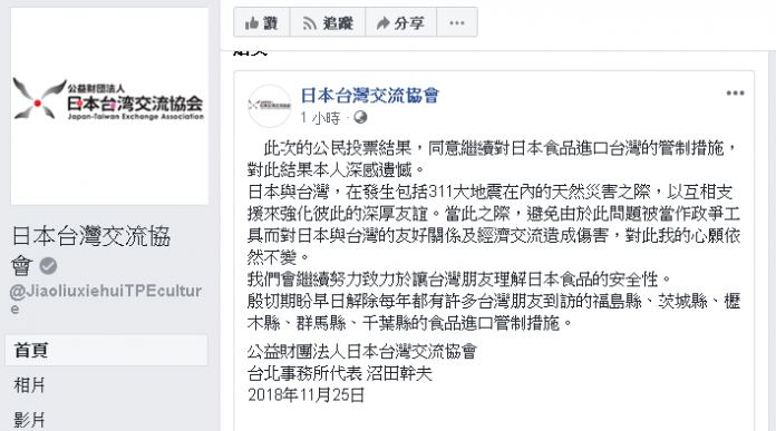 Andrew Lee, Sprecher des Auswärtigen Amtes sagte, dass Taiwan und Japan über die jeweilige Positition zu dem Thema im Klaren seien, das Außenministerium aber weiter der japanischen Seite das Ergebnis des Referendums kommunizieren werde.