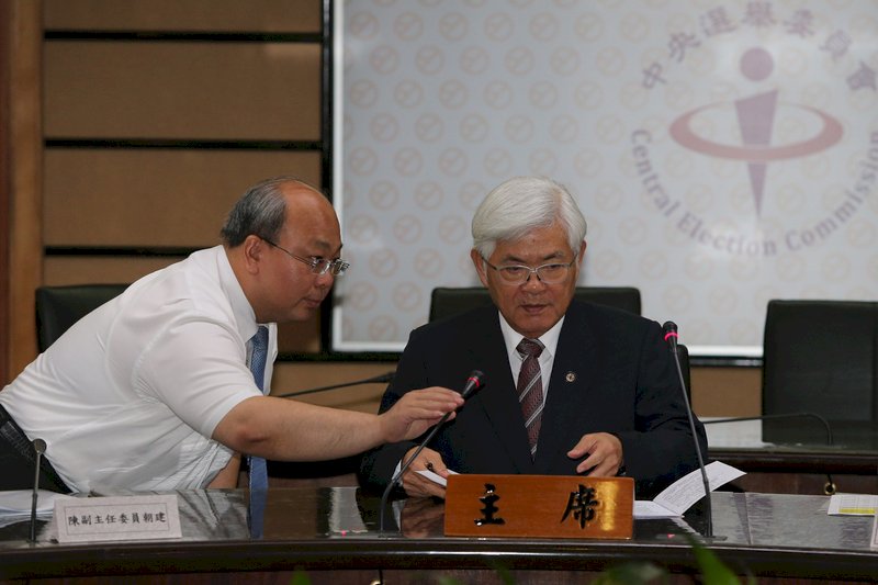 中選會主委李進勇(右)12日在中選會副主委陳朝建(左)的陪同下,出席「第15任總統副總統及第10屆立法委員選舉發布選舉」公告記者會,象徵2020總統選戰正式起跑,也呼籲民眾能夠踴躍投票。(圖:中央社)