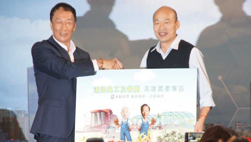 郭台銘宣佈不參與2020總統選舉,國民黨總統參選人韓國瑜競選辦公室表示,會盡一切努力爭取郭台銘的支持。圖為今年3月郭台銘與韓國瑜共同簽署合作備忘錄,宣布打造「AI高雄,智慧工農」計劃。(圖:中央社資料照片)