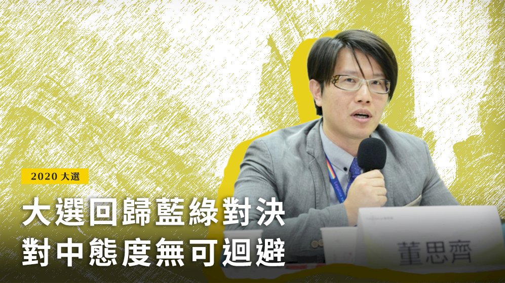 距離2020總統大選只剩不到4個月,依據目前態勢,明年總統大選基本上將回歸藍綠對決格局,台灣智庫國際事務部主任董思齊受訪表示,在原本的政黨政治格局裡,對中國的態度,是藍綠最被拿來突顯的政治立場,因此,要不要靠近中國將會在這場選舉愈到後面階段時,成為藍綠不可避免都要碰觸的議題。