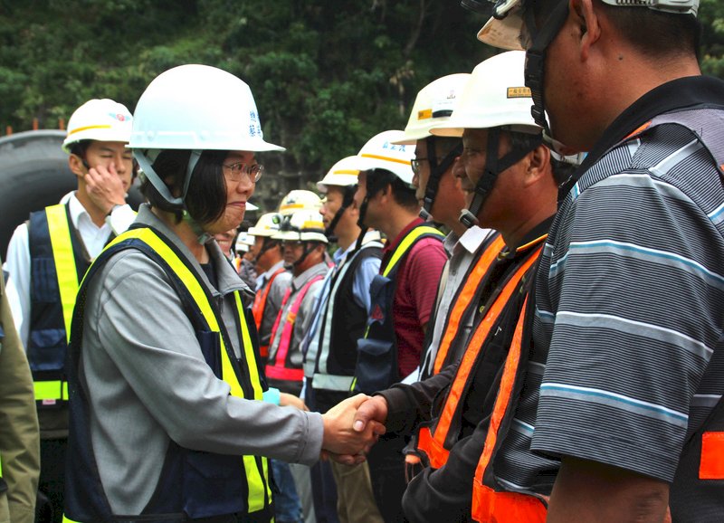 總統蔡英文(前左)1日上午到花蓮縣仁水隧道視察,關心蘇花公路改善工程進度,並逐一向工程人員握手致意,感謝他們的付出。(圖:中央社)