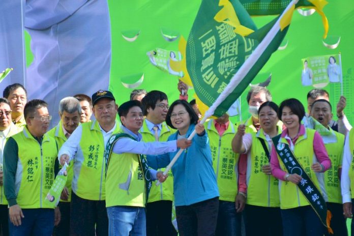總統蔡英文(前右)16日到新北市土城出席民進黨立委吳琪銘(前左)競選總部成立大會,總統進場後授戰旗給吳琪銘,盼望鄉親支持吳琪銘連任。(圖:中央社)