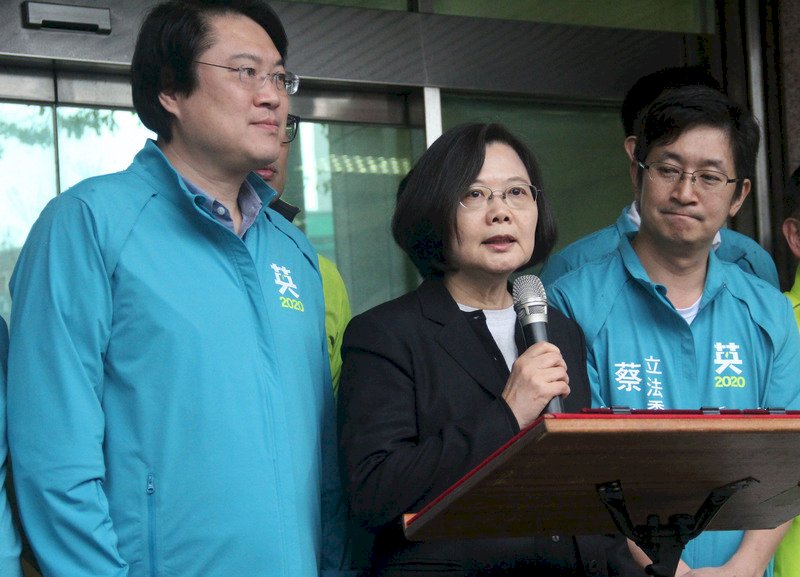 蔡英文總統(中)21日陪同民進黨立委蔡適應(右)登記參選立委後受訪,表示民進黨是在通過不分區名單前,先徵詢她的意見。(圖:中央社)