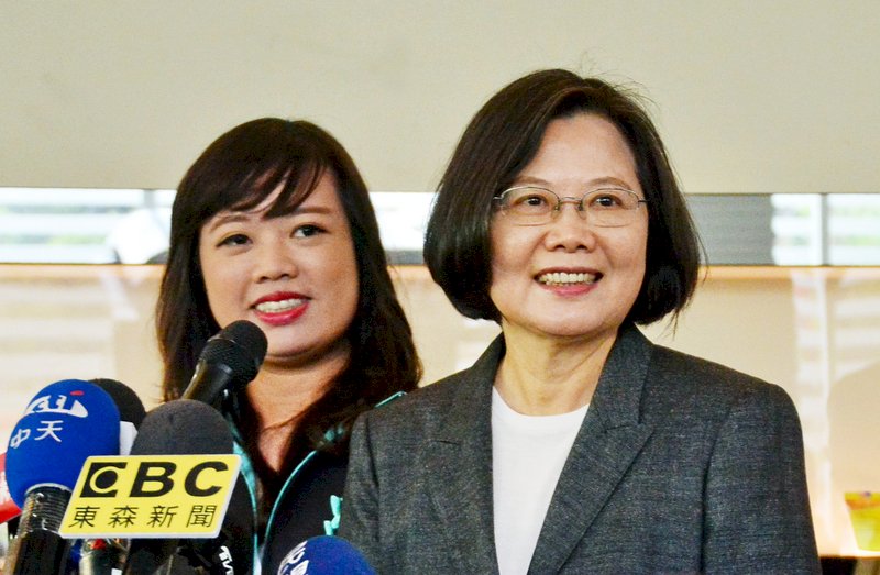 總統蔡英文(右)22日參訪康舒科技股份有限公司接受媒體聯訪表示,她不懂為何有上班的新北市、桃園市與台中市長都證實台商有投資,沒上班的市長卻說沒投資。(圖:中央社)