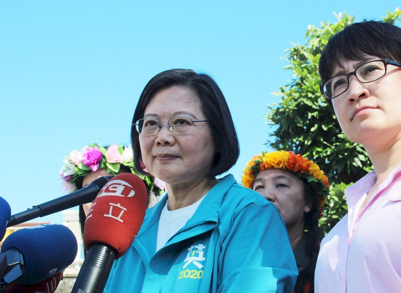 總統蔡英文(前中)23日上午出席民進黨總統、立法委員花蓮聯合競選總部成立大會後接受媒體聯訪表示,中國影響台灣大選意圖非常明顯,日前民進黨影片被變造就是案例,呼籲民眾要戒慎恐懼,守護重要民主資產。(圖:中央社)