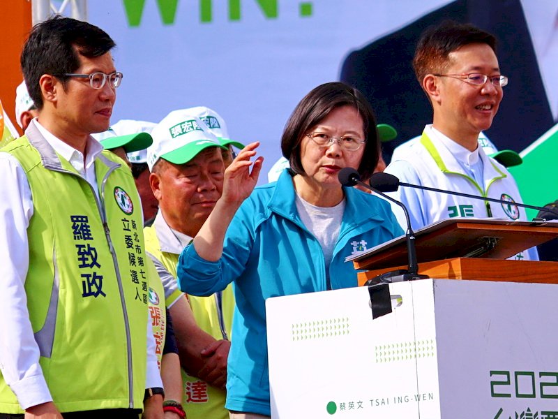 蔡英文總統(中)24日選舉行程滿檔,圖為她新北市板橋出席立委張宏陸(右)競選總部成立大會,左為立委羅致政 (央廣記者王照坤 攝)