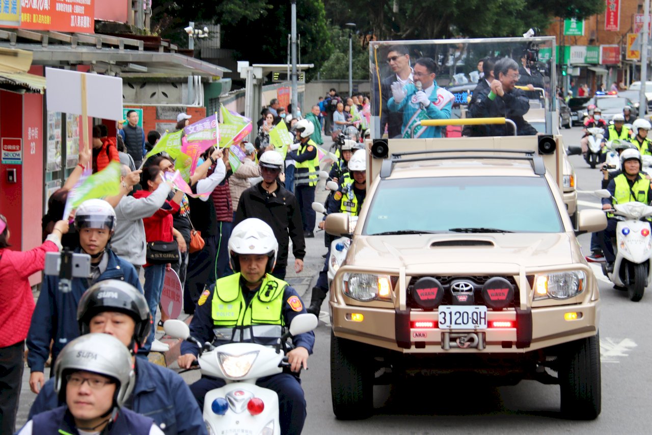 副總統陳建仁陪同台北市的黨籍立委候選人阮昭雄以車隊掃街拜票。(歐陽夢萍 攝)