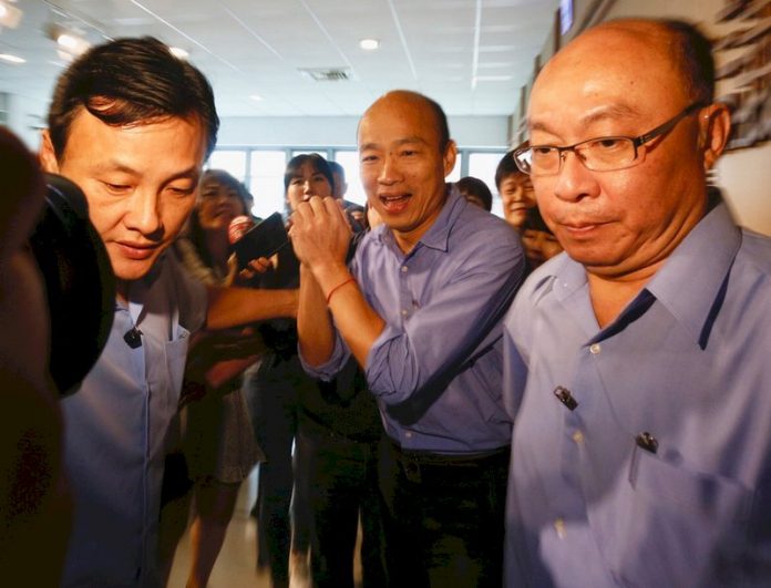 高雄市長韓國瑜(前中)27日在鳳山行政中心主持市政會議並接受媒體聯訪,結束後向媒體拱手致意表達感謝。(圖:中央社)