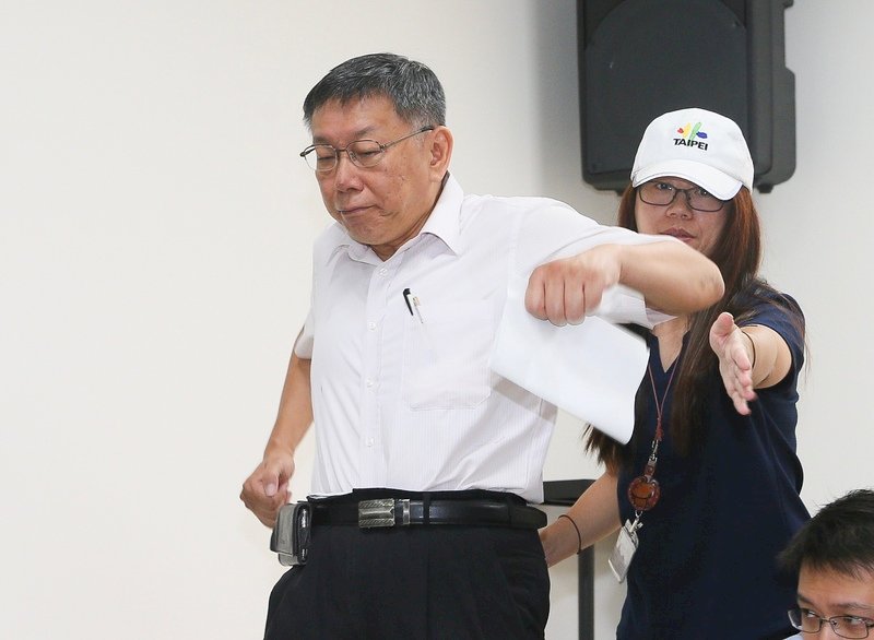 台北市長柯文哲(左)9日上午出席東明社會住宅招租記者會,受訪後在工作人員引導下,準備回到座位。(圖:中央社)