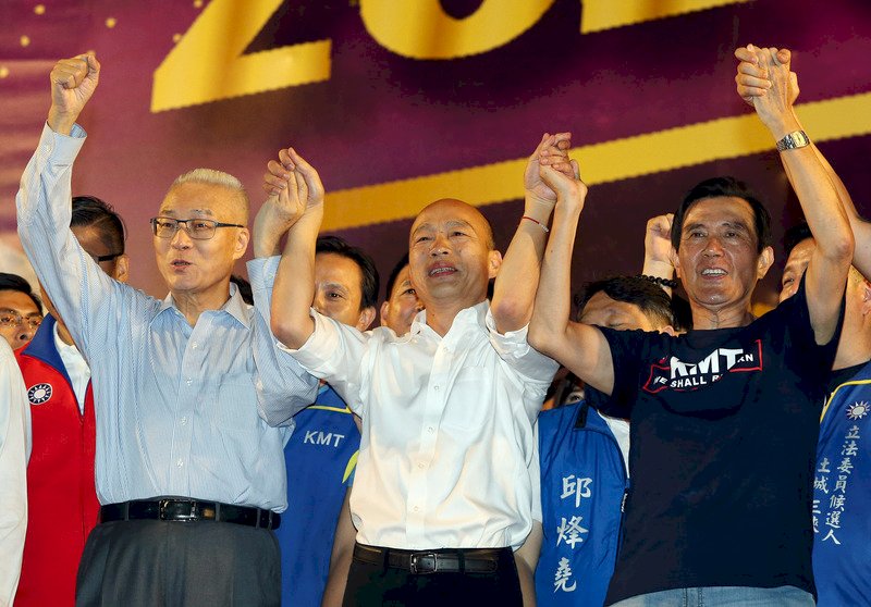國民黨總統參選人韓國瑜(中)8日晚間在新北市三重區幸福水漾公園舉辦「2020新北出發」萬人大造勢活動,國民黨主席吳敦義(左)、前總統馬英九(右)到場站台支持。(資料照片/CNA)