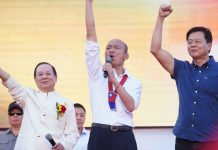 เรียงจากซ้ายไปขวา : ไช่อิงเหวิน ผู้นำคนปัจจุบัน ผู้สมัครรับเลือกตั้งตัวแทนพรรคประชาธิปไตยก้าวหน้า (DPP) นายซ่งฉู่อวี๋ ผู้สมัครจากพรรคพีเพิลเฟิรสต์ (PFP) และนายหานกั๋วอวี๋ ผู้สมัครจากพรรคก๊กมินตั๋ง(KMT)