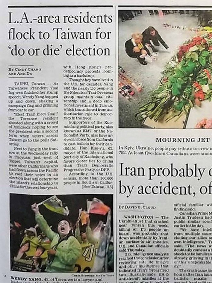 Tờ báo The Los Angeles Times đã chọn vị trí trang nhất để đăng bản tin kiều bào Đài Loan về nước bầu cử Tổng thống và Ủy viên lập pháp Đài Loan ngày 11 tháng 1 năm 2020.