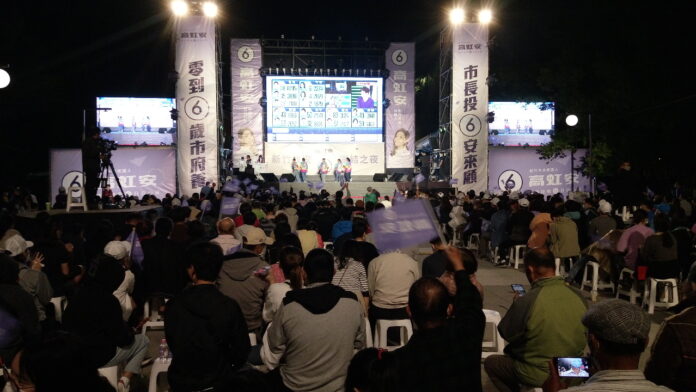 高虹安票數領先,支持者晚間陸續湧入新竹孔廟廣場。(陳國維 攝)