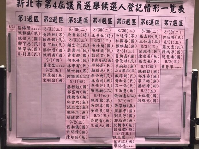 九合一選舉登記2日截止,新北市議員出現129人搶66席局面,其中新莊區與板橋區參選人超過應選席次2倍,參選人姓名多到貼出新北市選舉委員會登記板外。(新北市選舉委員會提供) (圖:中央社)