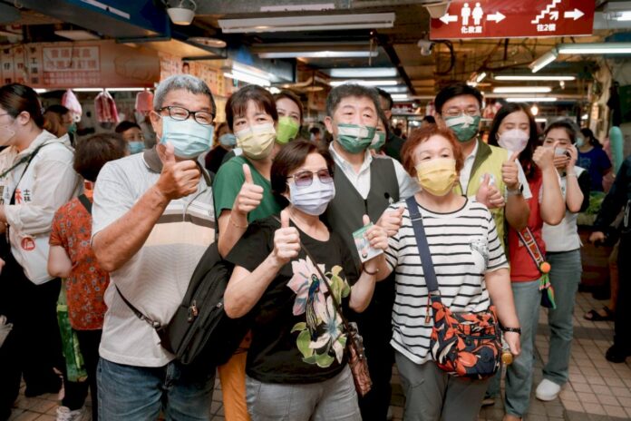 民進黨台北市長參選人陳時中(後排中)5日到北投市場拜票,與支持的民眾合影。(陳時中競總提供)